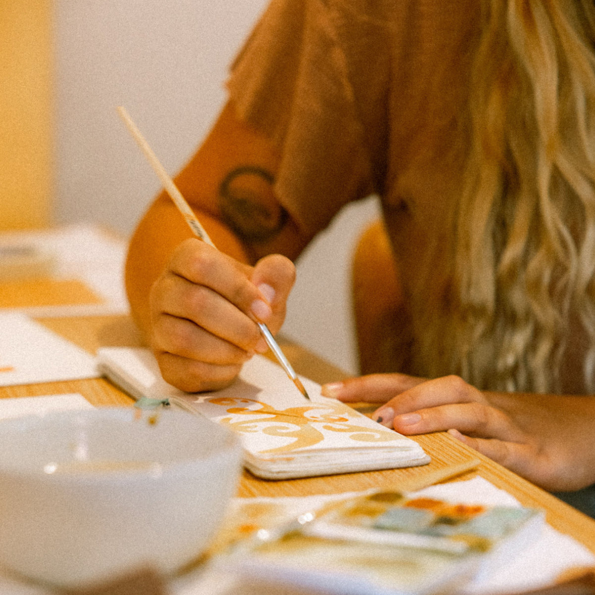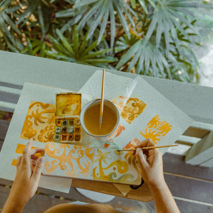 “MY ART IS TOTALLY A REFLECTION OF MY LIFE—SURF, THE TROPICS, AND BEING OUTSIDE. I’M LUCKY TO LIVE IN A PLACE WHERE I CAN PICK FRUIT RIGHT OUTSIDE MY DOOR AND ONLY A MOMENT AWAY FROM ADVENTURES. THAT ENERGY NATURALLY FLOWS INTO MY WORK. WHETHER I'M ON THE WATER, HIKING A WATERFALL, OR BASKING IN THE SUN, THOSE MOMENTS FUEL MY CREATIVITY. I FEEL SO CONNECTED TO WHAT I’M CREATING BECAUSE IT’S NOT JUST ART—IT’S MY EVERYDAY LIFE. MY WORK IS LIKE A LITTLE WINDOW INTO ME, WITH A PEACEFUL, EARTHY, NATURAL COLOR PALETTE- THE WAY I SEE THE WORLD. “