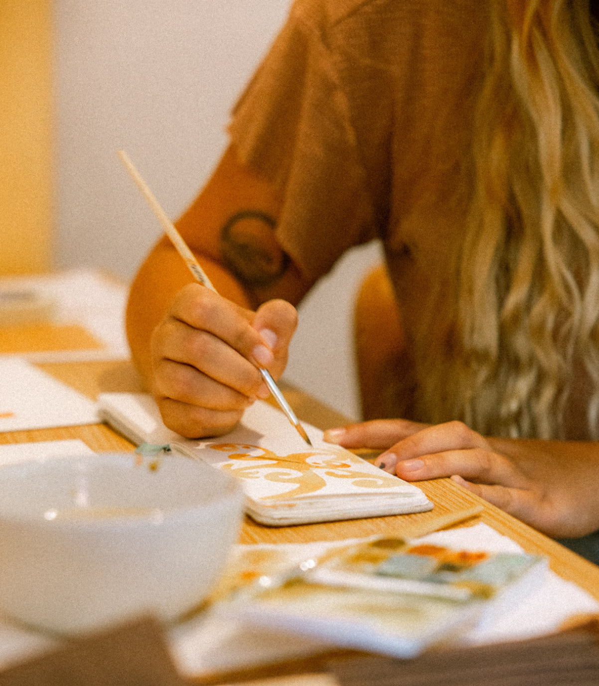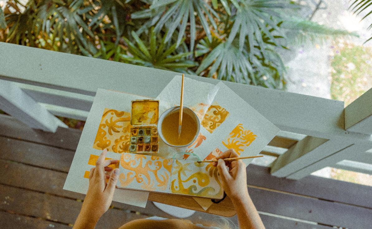 “MY ART IS TOTALLY A REFLECTION OF MY LIFE—SURF, THE TROPICS, AND BEING OUTSIDE. I’M LUCKY TO LIVE IN A PLACE WHERE I CAN PICK FRUIT RIGHT OUTSIDE MY DOOR AND ONLY A MOMENT AWAY FROM ADVENTURES. THAT ENERGY NATURALLY FLOWS INTO MY WORK. WHETHER I'M ON THE WATER, HIKING A WATERFALL, OR BASKING IN THE SUN, THOSE MOMENTS FUEL MY CREATIVITY. I FEEL SO CONNECTED TO WHAT I’M CREATING BECAUSE IT’S NOT JUST ART—IT’S MY EVERYDAY LIFE. MY WORK IS LIKE A LITTLE WINDOW INTO ME, WITH A PEACEFUL, EARTHY, NATURAL COLOR PALETTE- THE WAY I SEE THE WORLD. “